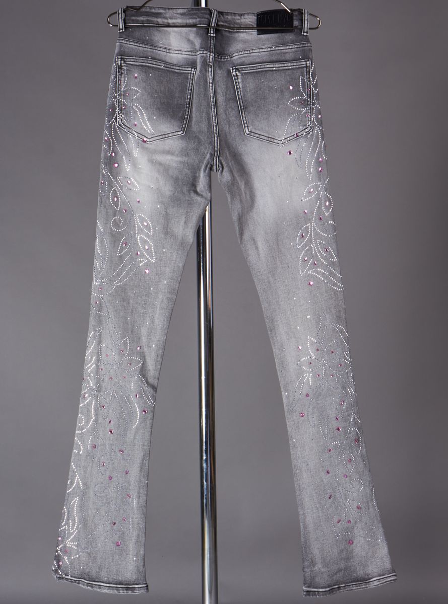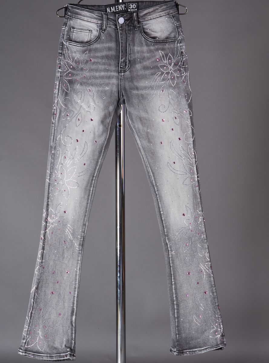 N.M.ENYC FLORAL RHINSTONE JEANS - NME25 - GREY/PINK